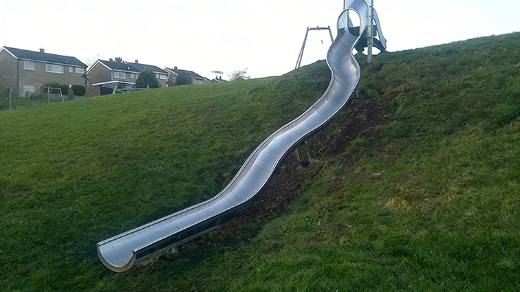 這是一款依托自然草坡地形打造的戶外不銹鋼滑梯,采用流暢的波浪形設(shè)計(jì),銀亮的金屬質(zhì)感與翠綠的草坡形成鮮明視覺對(duì)比,造型簡(jiǎn)約現(xiàn)代且與自然環(huán)境高度融合。