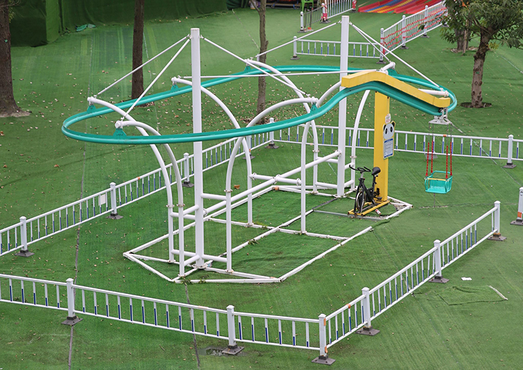 • 它的核心玩法是 “家長(zhǎng)發(fā)力、孩子體驗(yàn)”:家長(zhǎng)通過(guò)腳蹬自行車(chē)為滑索提供動(dòng)力,孩子則懸掛在滑索吊椅上,沿著環(huán)形軌道體驗(yàn)飛旋滑行的樂(lè)趣,全程充滿(mǎn)親子協(xié)作的歡樂(lè)感。設(shè)備采用堅(jiān)固的鋼結(jié)構(gòu)支架與耐磨滑索,無(wú)電力驅(qū)動(dòng),搭配防護(hù)圍欄與緩沖裝置,安全系數(shù)高,適配 3-12 歲兒童游玩,適合安置在親子樂(lè)園、社區(qū)綠地、文旅營(yíng)地等場(chǎng)景,既能憑借 “坑爹” 的趣味梗成為網(wǎng)紅打卡點(diǎn),也能通過(guò)強(qiáng)互動(dòng)屬性吸引家庭客群,是打造沉浸式親子游樂(lè)場(chǎng)景的熱門(mén)項(xiàng)目。