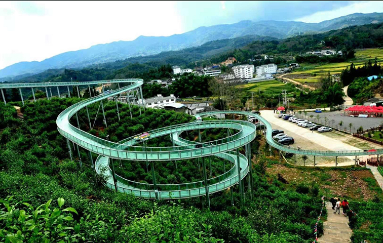 • 這是一款依托山地茶園地貌打造的高空玻璃漂流設(shè)備,采用全透明鋼化玻璃搭建的蜿蜒滑道,盤旋穿梭于翠綠茶山與層疊山巒之間,視覺上如一條綠色絲帶懸浮于天際。