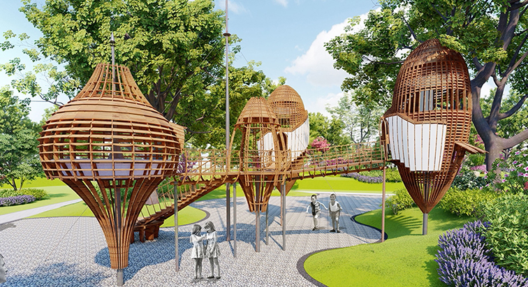 • 這是一組以自然編織美學(xué)為核心的戶外特色樹屋集群,采用原木材質(zhì)編織成燈籠狀與鳥巢狀的架空小屋,通過木質(zhì)棧道串聯(lián)成整體,造型如散落林間的天然巢穴,與周邊綠樹繁花高度融合,充滿野趣與童話感。