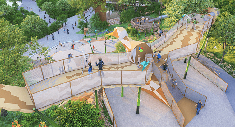 這是一款專為兒童打造的架空探險步道,以錯落起伏的平臺、網(wǎng)狀防護(hù)欄與幾何拼接的防滑面板為核心設(shè)計,整體造型如穿梭于林間的云階,視覺上充滿童趣與探索感,與周邊綠植、廣場自然融合。