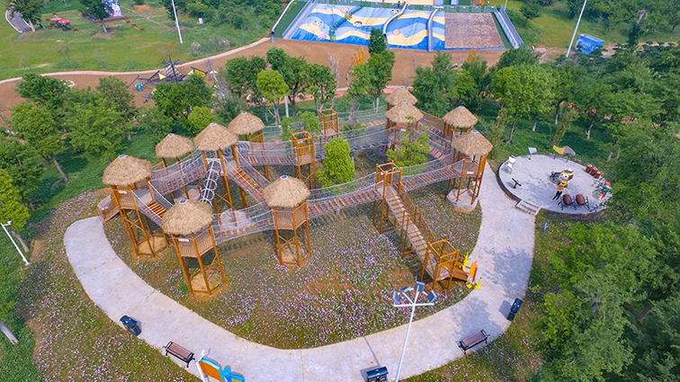這是一款充滿熱帶部落風情的室外無動力拓展游樂設備,以木質塔樓與茅草屋頂為核心設計,構建出蜿蜒交錯的高空棧道與網陣,讓游客在綠意盎然的環境中體驗高空穿越的樂趣。主體采用環保防腐實木搭建支撐框架與棧道,搭配天然茅草屋頂與高強度防護網,既還原了部落的質樸質感,又保障了結構穩固與游玩安全。設備集高空行走、平衡挑戰、親子互動于一體,適用于城市公園、親子景區、研學基地等場景,讓孩子們在沉浸式的部落探險中鍛煉平衡感、勇氣與協作能力,同時感受自然與人文創意融合的獨特魅力。