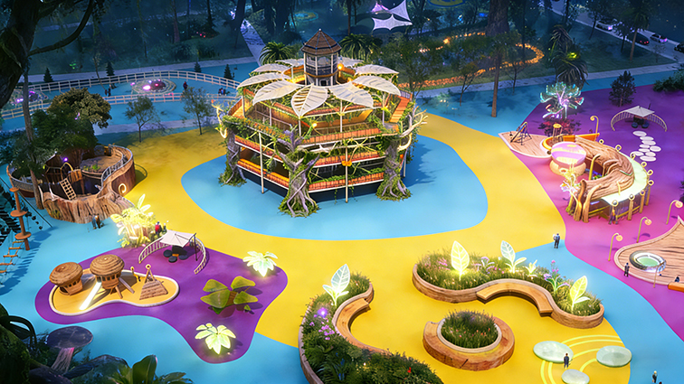 • 這是一款沉浸式奇幻風(fēng)格室外拓展游樂設(shè)備,以熒光森林秘境為設(shè)計靈感,打造出多層錯落的樹屋平臺、蜿蜒棧道與發(fā)光互動裝置,搭配大面積彩色地面與仿真綠植,營造出夢幻的夜間探險氛圍。主體采用環(huán)保防腐實木搭建樹屋與棧道,搭配高強度鋼材框架與 LED 燈光系統(tǒng),既保障了結(jié)構(gòu)穩(wěn)固與游玩安全,又通過鮮明色彩與發(fā)光裝置形成強烈視覺沖擊。設(shè)備集高空行走、親子互動、沉浸式打卡于一體,適用于主題樂園、文旅綜合體、研學(xué)基地等場景,讓游客在奇幻森林中鍛煉平衡感、勇氣與探索精神,開啟一段充滿驚喜的熒光探險之旅。